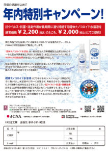 日頃の感謝を込めて年内限定の特別キャンペーンを実施します。 弊社の施工にも使用している錯体ナノコロイド水溶液のスプレーボトル(100ml)通常価格2,200円(税込)を特別価格2,000円(税込)にて販売いたします。 錯 […]